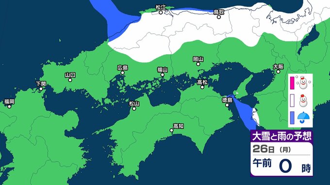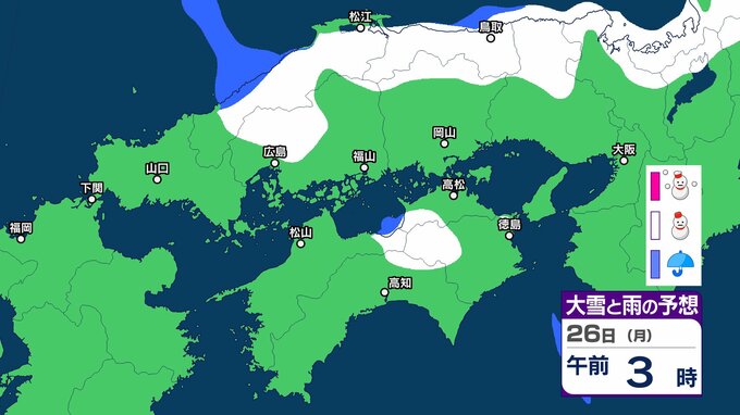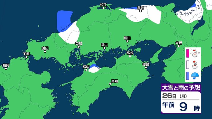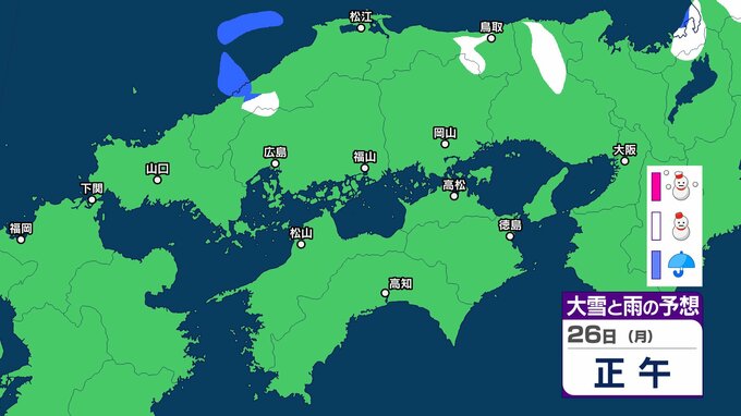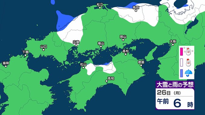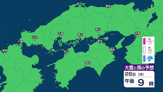 【中国・四国地方の雪 どうなる?】あす朝は広島・福山・岡山など瀬戸内側でも雪雲が…四国地方は23日夜遅くから24日夕方にかけて山地を中心に大雪、平地でも大雪のおそれ 岡山・広島・山口・鳥取・島根・香川・愛媛・高知・徳島 23日(金)~28日(水)雪雨シミュレーション【気象庁 23日午後6時更新】 RSK山陽放送 2026年1月23日(金) 19:29 国内 天気 26日(月) シミュレーションでは、中国山地、四国山地に雪雲がかかっています。 ▶中国・四国地方の雪雨シミュレーション