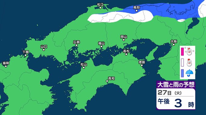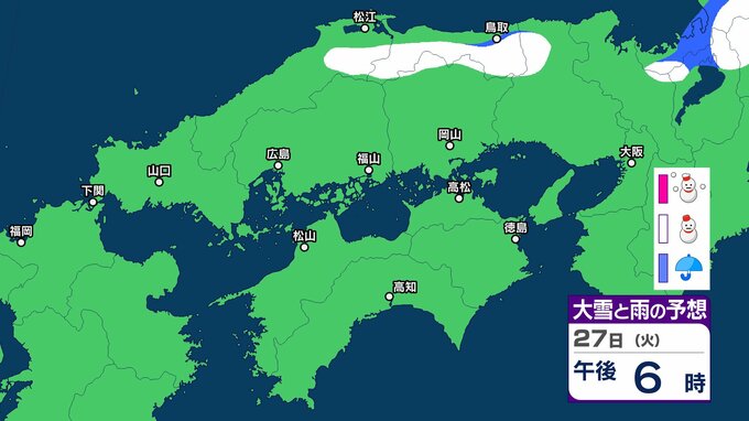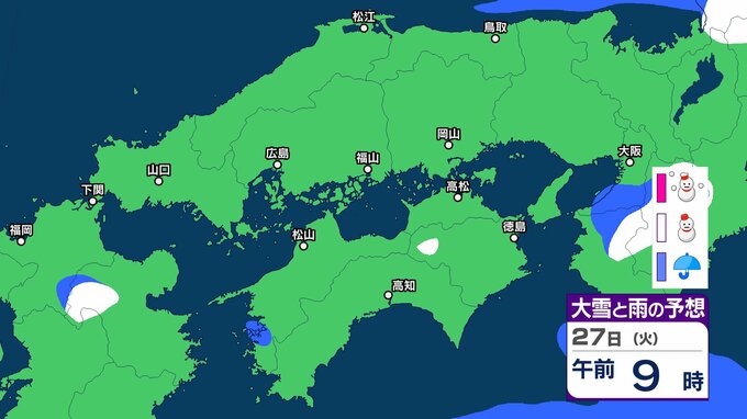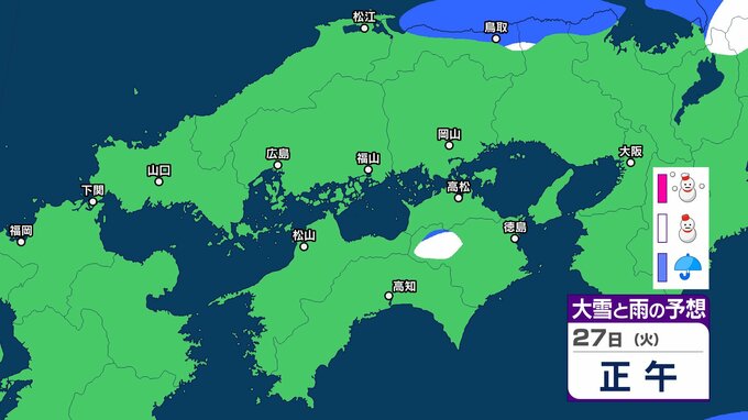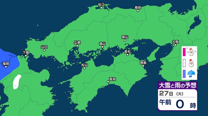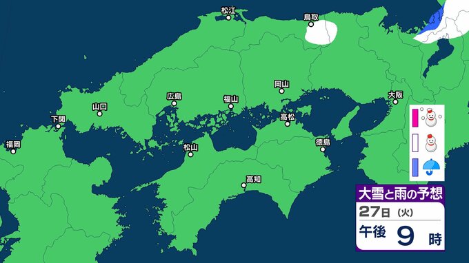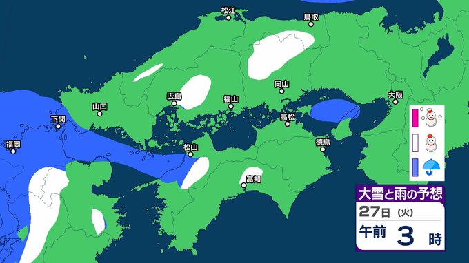 【中国・四国地方の雪 どうなる?】あす朝は広島・福山・岡山など瀬戸内側でも雪雲が…四国地方は23日夜遅くから24日夕方にかけて山地を中心に大雪、平地でも大雪のおそれ 岡山・広島・山口・鳥取・島根・香川・愛媛・高知・徳島 23日(金)~28日(水)雪雨シミュレーション【気象庁 23日午後6時更新】 RSK山陽放送 2026年1月23日(金) 19:29 国内 天気 27日(火) シミュレーションでは、未明から午前中にかけて中国、四国地方の一部地域に雪雲がかかっています。 ▶中国・四国地方の雪雨シミュレーション