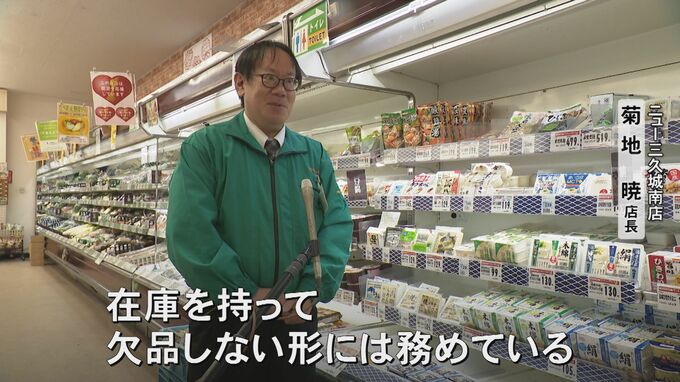 ニュー三久城南店・菊地暁店長「商品が遠く(県外)から入ってこないのを防ぐために、事前に賞味期限の長い商品を多めに発注して在庫を持って欠品しない形には努めている」