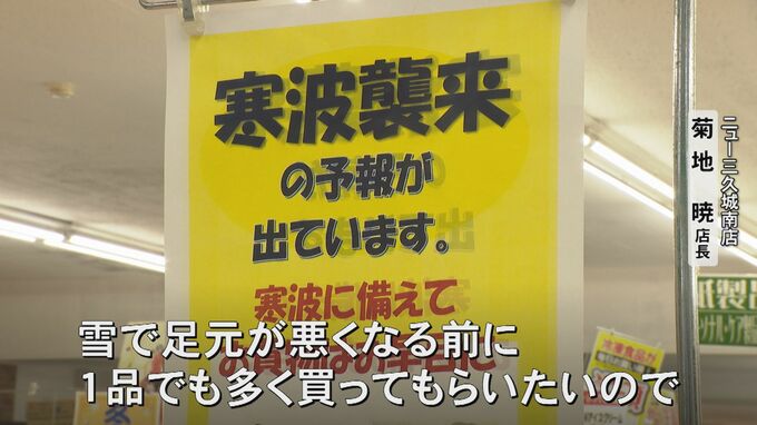 ニュー三久城南店・菊地暁店長「雪で足元が悪くなる前に一品でも多く買ってもらいたいので、日持ちするような商品は注意喚起の形でポスターをつけています。売れています」