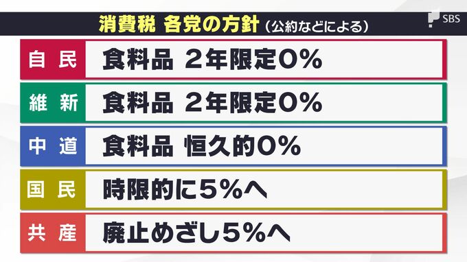 新党の中道改革連合は「食料品を恒久的に0%」、国民民主党は「時限的に5%へ」、共産党は「廃止目指し5%へ」としています。