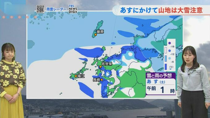 24日(土)の長崎は雨や雪が降る見込みです。特に山地では大雪に注意が必要です。最高気温は6~9℃、最低気温は0~5℃と予想されています。