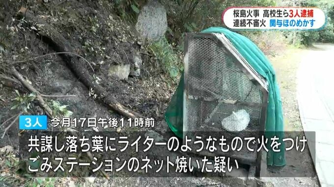 鹿児島中央警察署によりますと3人は共謀し、今月17日午後11時前、鹿児島市桜島横山町でごみステーション付近の落ち葉にライターのようなもので火をつけ、ごみステーションのネットを焼いた疑いがもたれています。