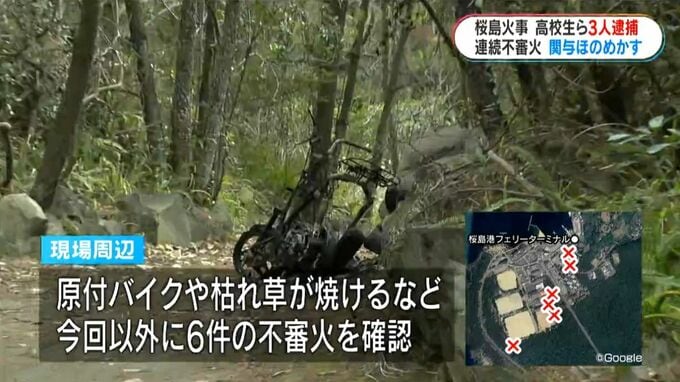 桜島では今月15日からの4日間に現場の周辺で原付バイクが全焼したり枯れ草が焼けたりするなど、今回の火事の他に6件の不審火を確認していて、3人の一部は関与をほのめかしているということです。