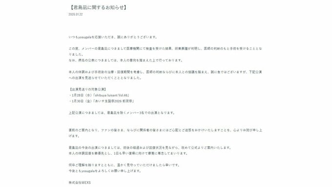 同日、「yosugala」の公式Xでも「メンバー、君島凪につきまして、医師の判断のもと手術を受けることとなり、一部公演への出演を見送らせていただきます」とお知らせを発表。