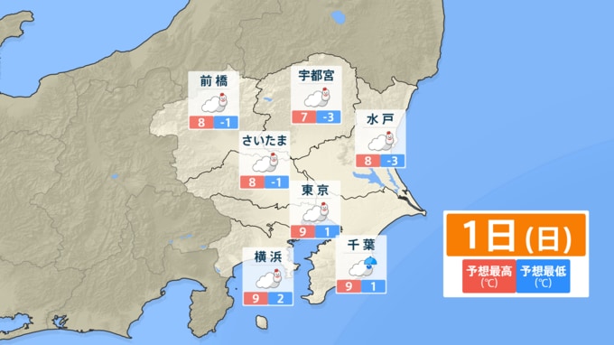 東京・横浜・さいたま・前橋・宇都宮・水戸で予想最高気温は8℃前後。