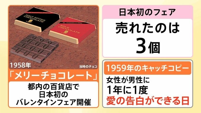 最初は1958年、「メリーチョコレート」が都内の百貨店で日本初のバレンタインフェアを開催しました。3日間行われましたが、このフェアで売れたのはわずか3個でした。