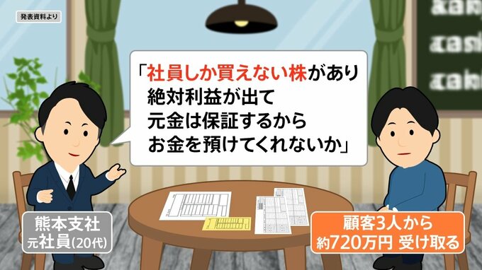 熊本支社の元社員(20代)が、顧客に対し、「社員しか買えない株があり、絶対利益が出て元金は保証するから、お金を預けてくれないか」と、投資話を持ちかけ、顧客3人から約720万円を受け取ったということです。