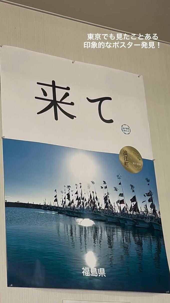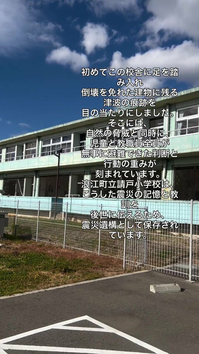 「東京でも見たことある印象的なポスター発見!」と感銘を受けつつ、浪江町立請戸小学校に移動。震災遺構となっているこの場所で「児童と教職員全員が(津波から)無事に避難できた判断と行動の重みが刻まれています」と伝えています。