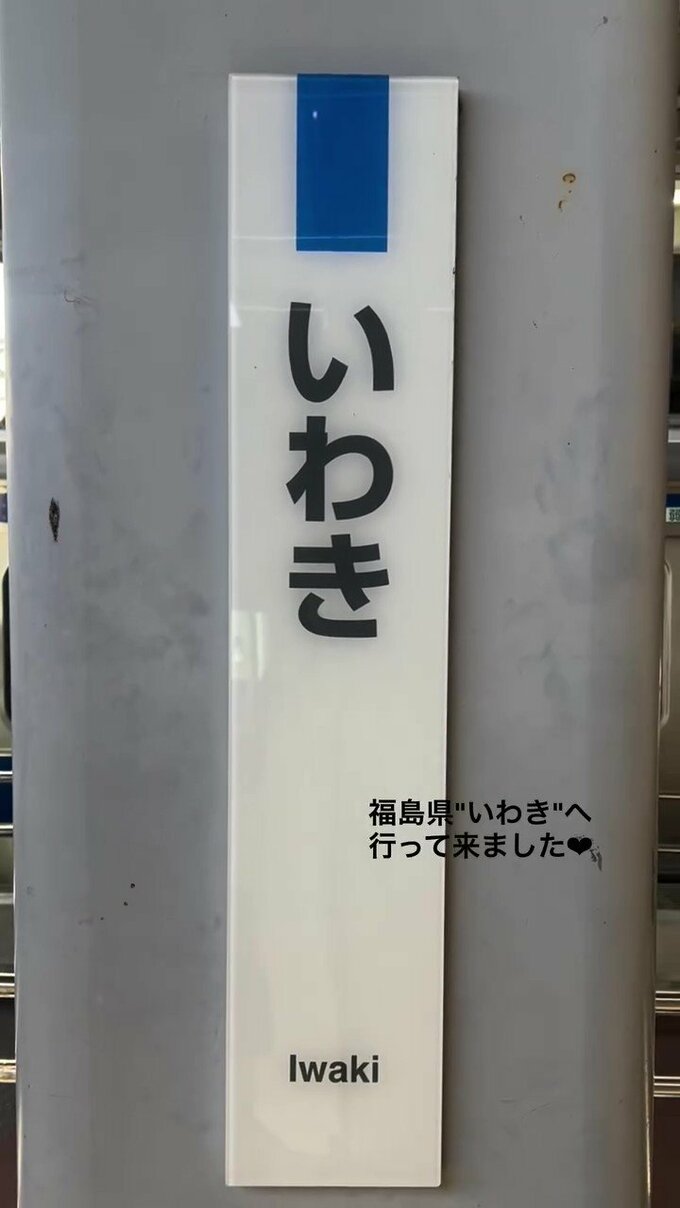 松村さんは電車の車窓を映しつつ「電車に乗って初めての街」と、旅情豊かに動画をスタート。「いわき」という駅名看板を見せて「福島県 “いわき” へ行ってきました」と紹介しました。