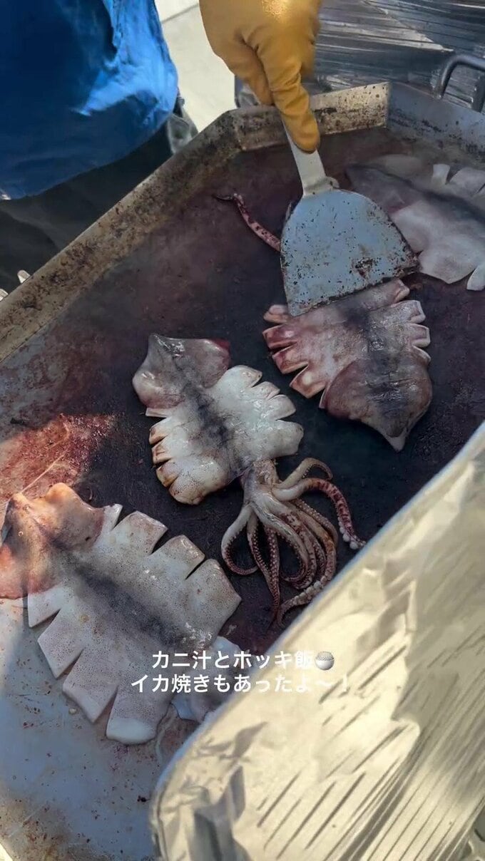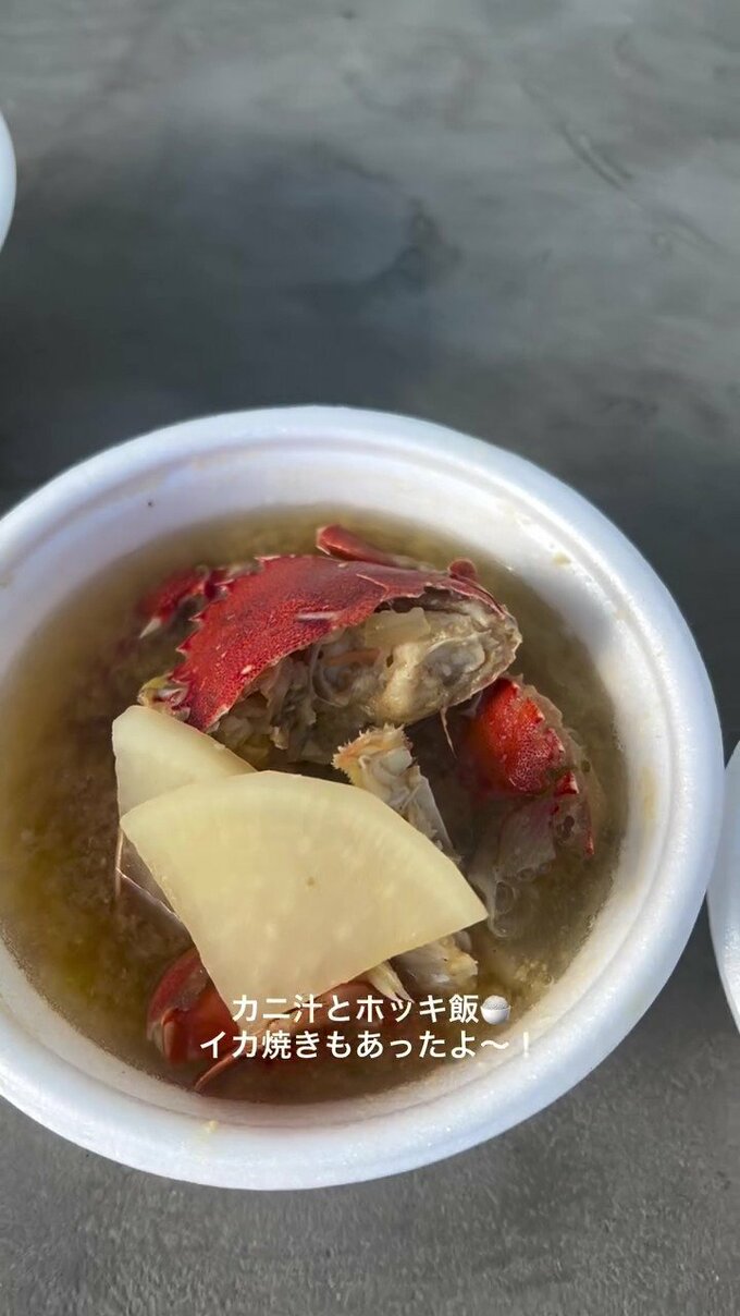普段は一般開放していない漁港での年に一度のイベントに赴いた松村さんは、大物揃いの海鮮に驚きつつ「カニ汁とホッキ飯 イカ焼きもあったよ~!」とうれしそう。
