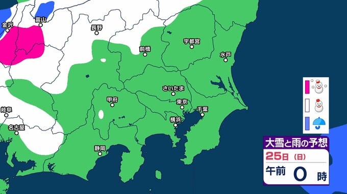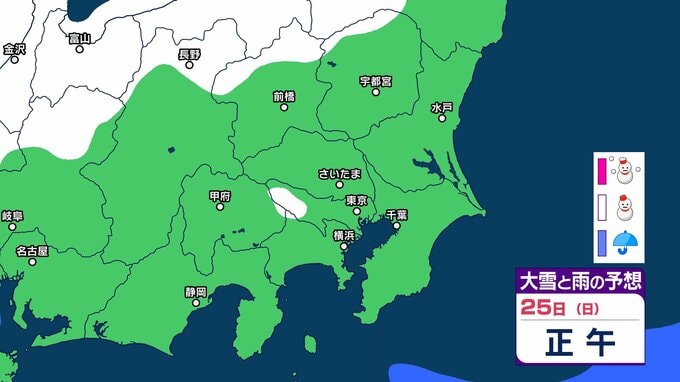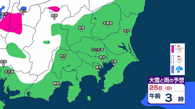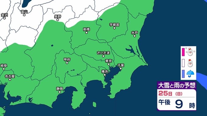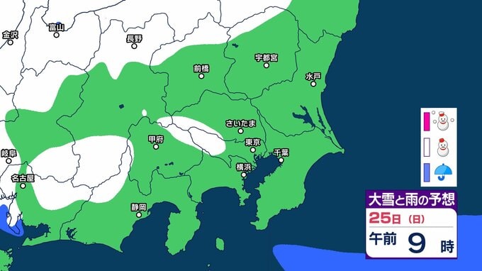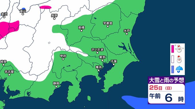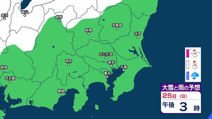 【東京の雪予想】25日6時までの24時間予想降雪量は「関東地方北部の多いところで25センチ」25日にかけて関東甲信地方「上空約5500mに-36度以下の強い寒気」24日(土)~29日(木)東京、横浜、埼玉、千葉、茨城など首都圏の雪は? 雪雨シミュレーション【気象庁/24日午前9時40分】 RSK山陽放送 2026年1月24日(土) 09:44 国内 天気 25日(日) シミュレーションでは長野県、東京都、山梨県、埼玉県、群馬県の一部地域で雪雲がみられます。 6 7 8 9 10 11 12 13 ▶雪と雨のシミュレーション