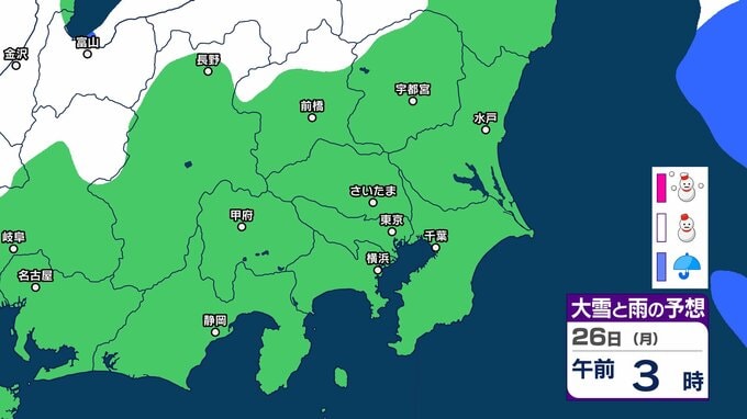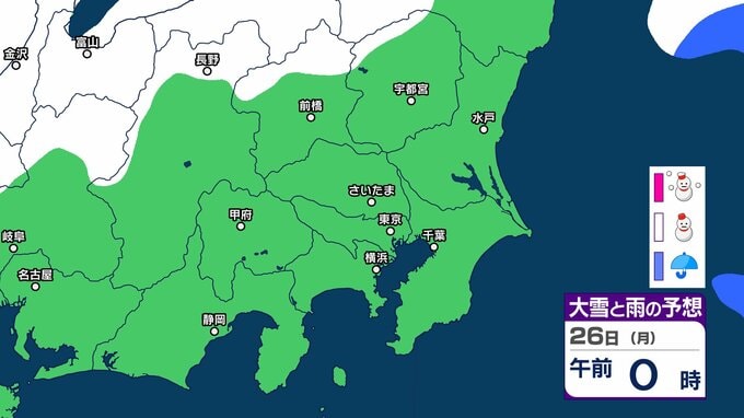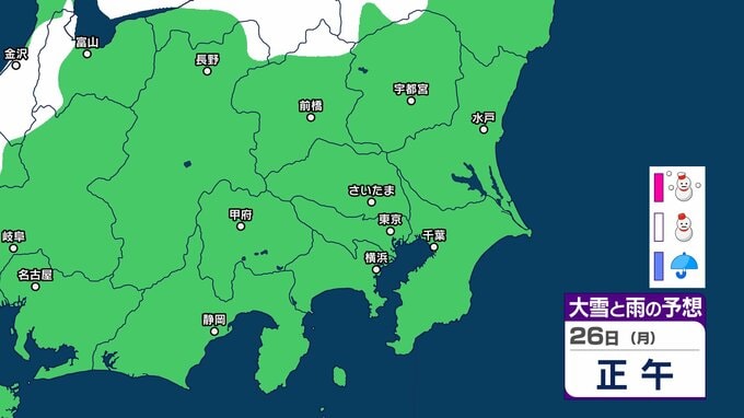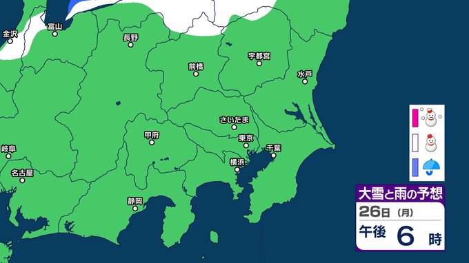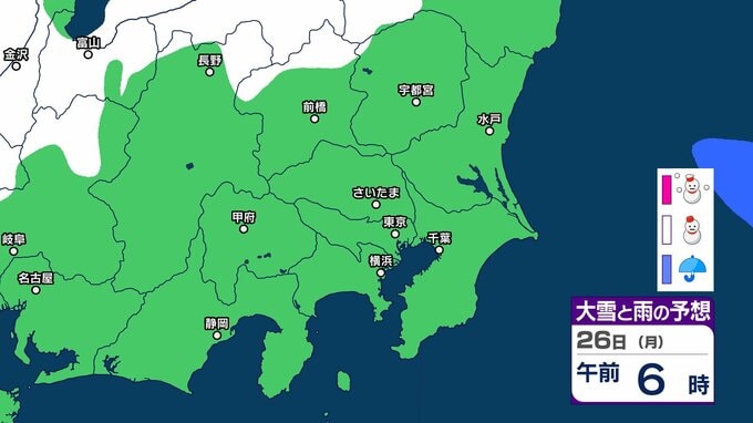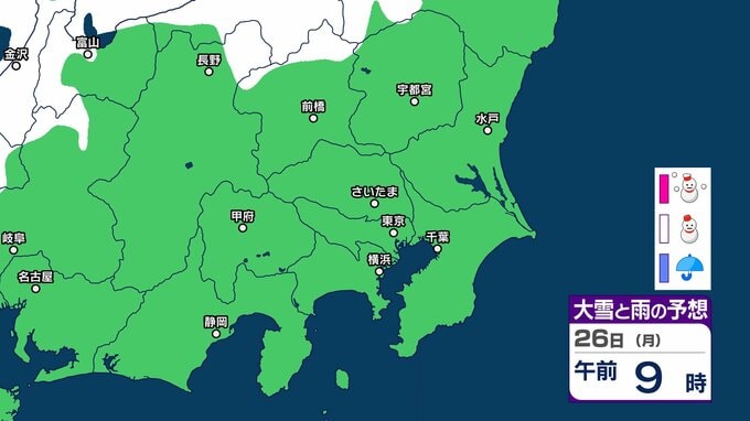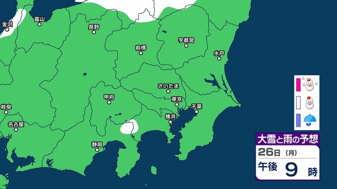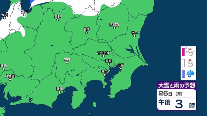 【東京の雪予想】25日6時までの24時間予想降雪量は「関東地方北部の多いところで25センチ」25日にかけて関東甲信地方「上空約5500mに-36度以下の強い寒気」24日(土)~29日(木)東京、横浜、埼玉、千葉、茨城など首都圏の雪は? 雪雨シミュレーション【気象庁/24日午前9時40分】 RSK山陽放送 2026年1月24日(土) 09:44 国内 天気 26日(月) 26日(月)は静岡県、長野県、群馬県の一部地域などに雪雲が広がる予報となっています。 14 15 16 17 18 19 20 21 ▶雪と雨のシミュレーション
