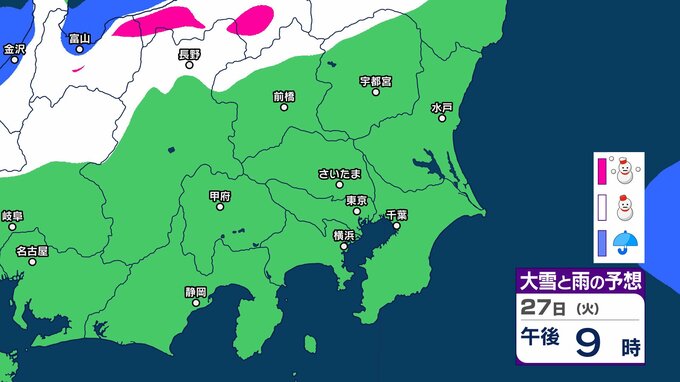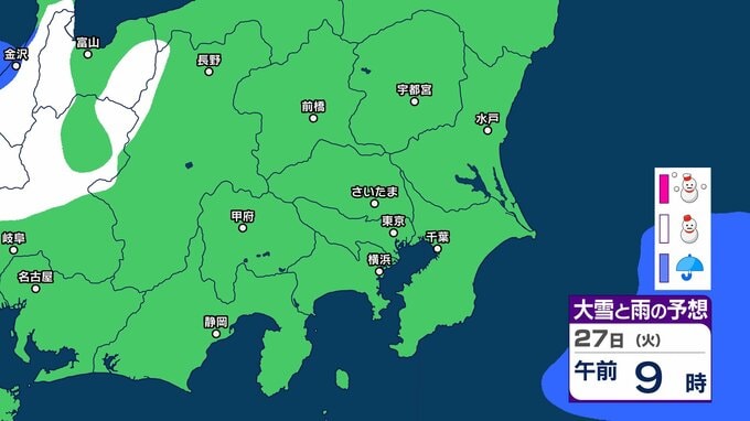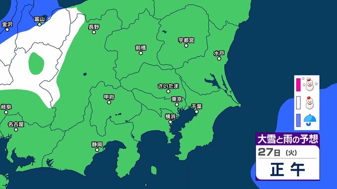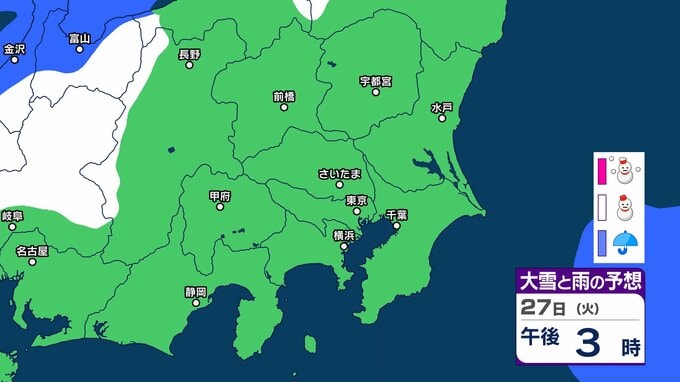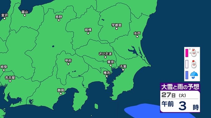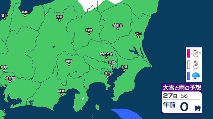 【東京の雪予想】25日6時までの24時間予想降雪量は「関東地方北部の多いところで25センチ」25日にかけて関東甲信地方「上空約5500mに-36度以下の強い寒気」24日(土)~29日(木)東京、横浜、埼玉、千葉、茨城など首都圏の雪は? 雪雨シミュレーション【気象庁/24日午前9時40分】 RSK山陽放送 2026年1月24日(土) 09:44 国内 天気 27日(火) 雪と雨のシミュレーションでは、長野県、群馬県の一部に雪雲がかかる予想です。 22 23 24 25 26 27 28 ▶雪と雨のシミュレーション