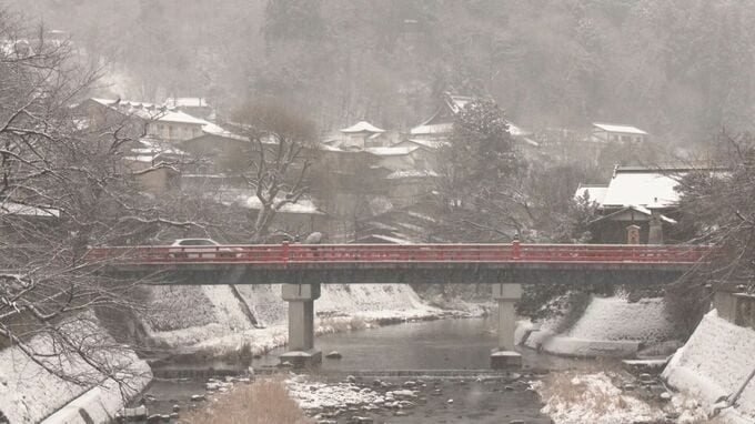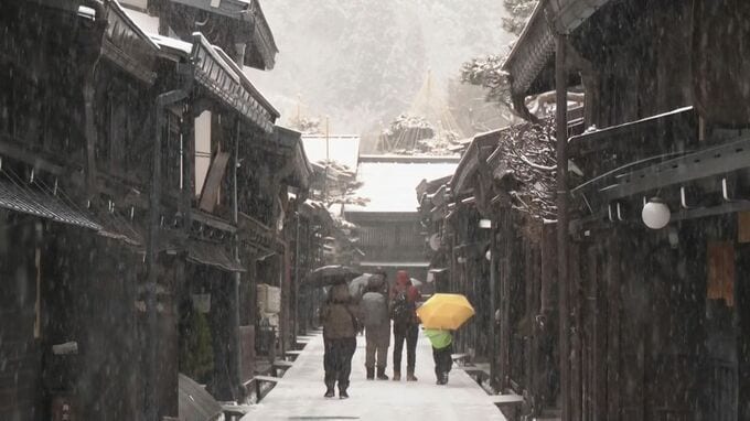 岐阜県高山市では中橋の手すりにも雪が積もり、観光客が雪景色を写真に収めました。午前11時の積雪は高山市で3センチ、白川村で92センチ、郡上市長滝では84センチと、前日23日の同じ時間に比べ、60センチ以上増えています。