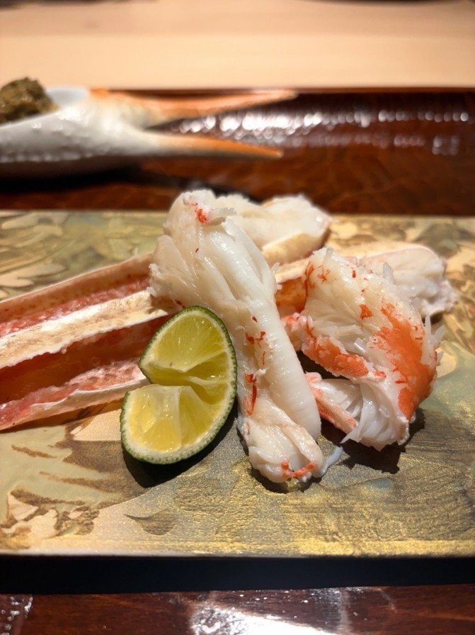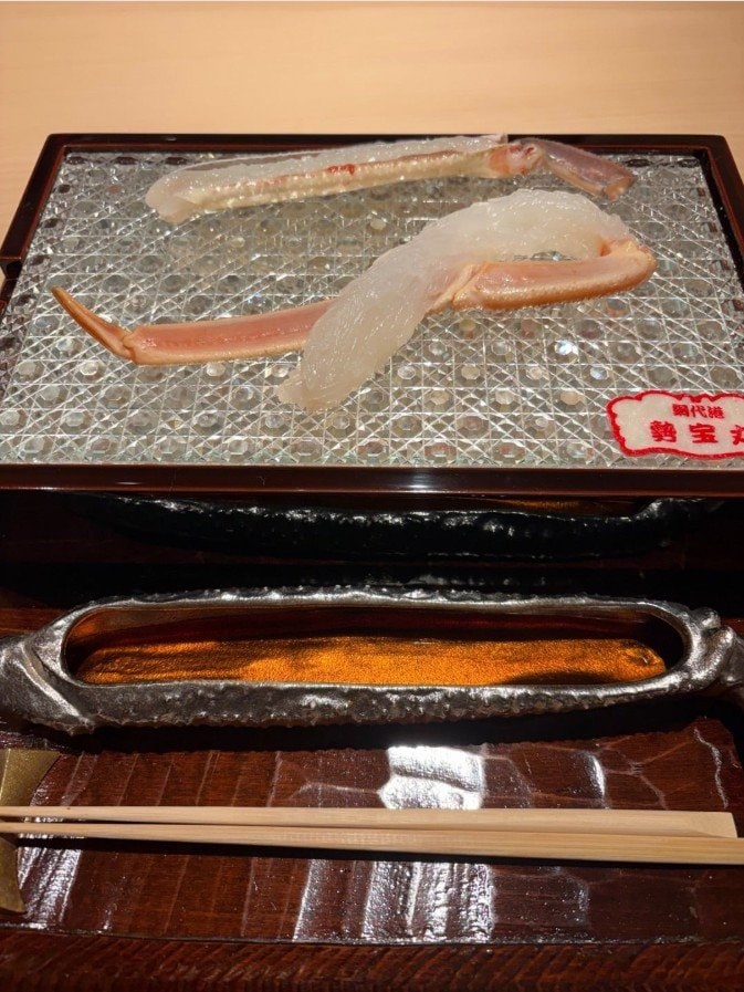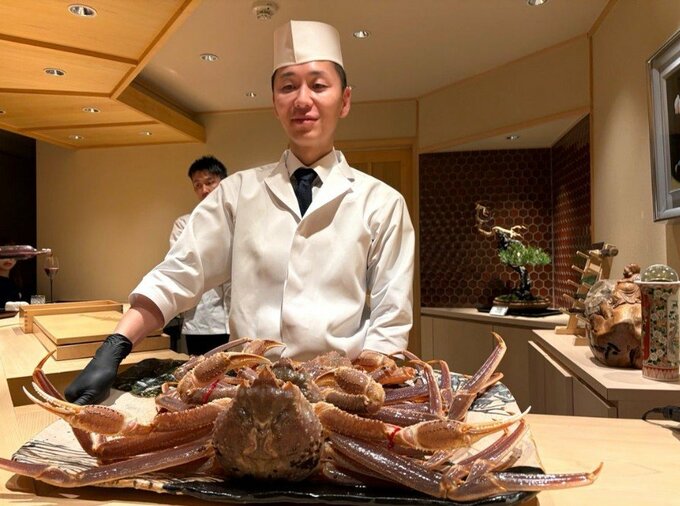 藤さんは、カウンターに鎮座する「1.5Kgの活松葉蟹」や、捌かれた蟹の刺身を「まずはそのままで!」甲羅に盛られた蟹味噌を「4杯分の蟹味噌」殻からほぐしてスダチを添えられた「焼き蟹と一緒に」など、見事な蟹料理の写真を次々に投稿。