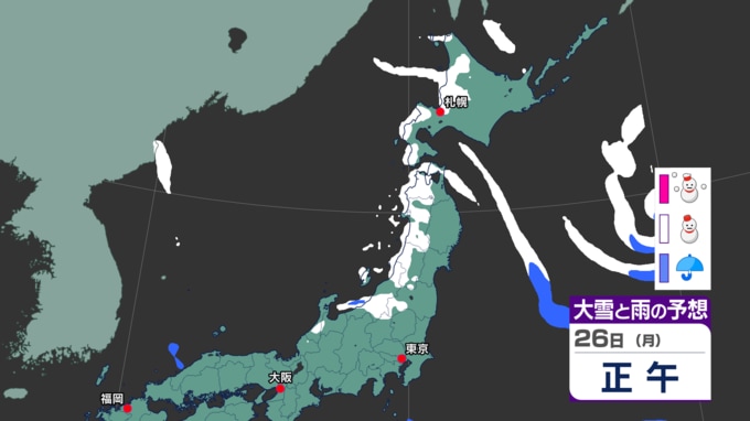 東北地方と東日本では、25日にかけて大雪や路面の凍結による交通障害に警戒し、北海道地方と西日本では注意・警戒してください。また、電線や樹木への着雪、なだれに注意してください。