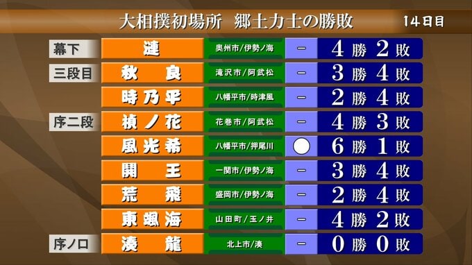 序二段の風光希は勝って6勝1敗で今場所の取り組みを終えました。このほか、郷土力士の取り組みはありませんでした。