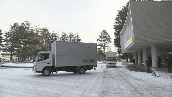 県庁では24日朝、衆議院選挙の投票用紙、小選挙区と比例代表、それぞれ158万1000枚がトラックに積み込まれました。投票用紙は24日のうちに県内すべての市町村に届けられますが、急な日程のため、各市町村からの投票所入場券の到着が期日前投票に間に合わない可能性があるということです。