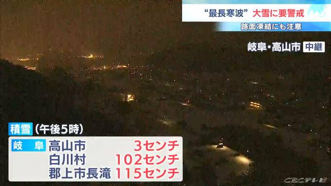 24日午後5時の積雪は岐阜県高山市で3センチ、白川村で102センチ、郡上市長滝では115センチで、現在、高山市、飛騨市、白川村などに大雪警報が出ています。