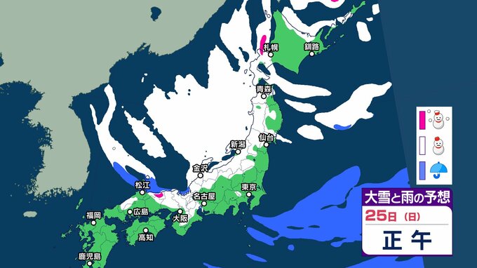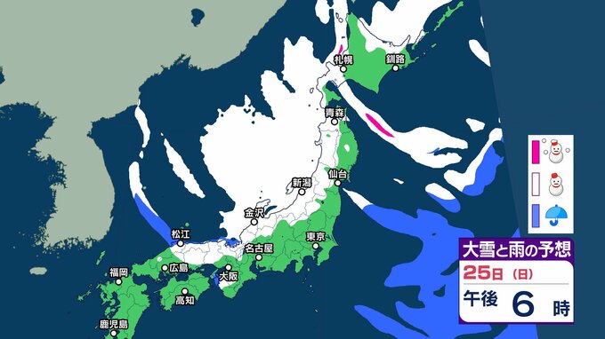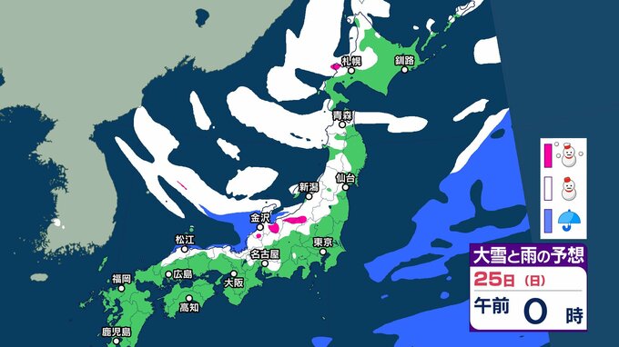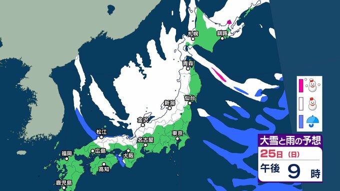 気象庁によりますと、東日本では、25日にかけて路面の凍結による交通障害に警戒。北日本と西日本では注意・警戒が必要。また電線や樹木への着雪、なだれに注意が必要だということです。東日本から西日本の日本海側を中心に突風や竜巻などの激しい突風にも注意。降ひょうのおそれもあるため農作物や農業施設の管理にも注意が必要だということです。