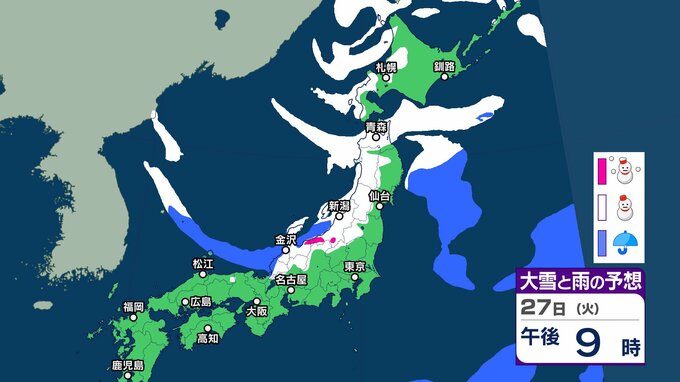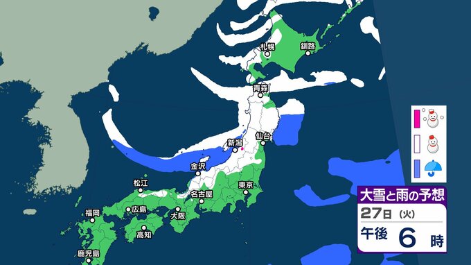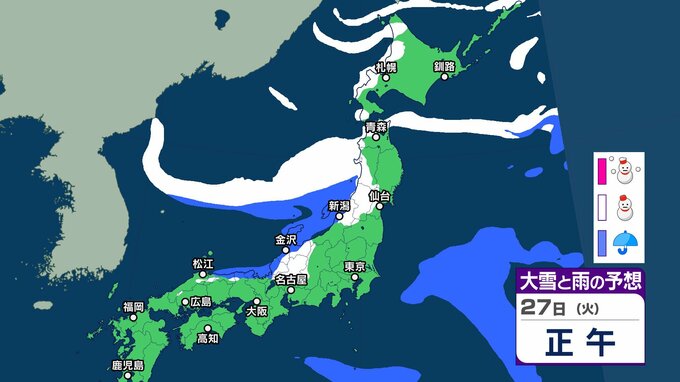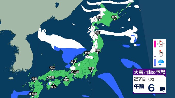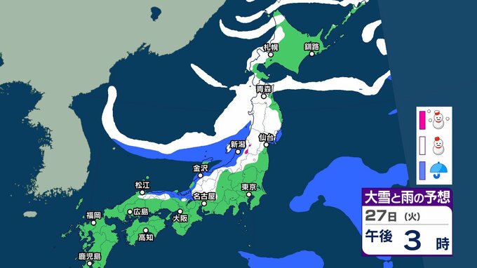 【大雪予報】東北地方から山陰では積雪の深さが平年の2倍以上 大雪や路面の凍結による交通障害に注意、警戒を【気象庁 24日(土)~29日(木)の雪雨シミュレーション/24日午後7時更新】 RSK山陽放送 2026年1月24日(土) 19:22 国内 天気 27日(火) 気象庁の雪と雨のシミュレーションによりますと、27日は、東北や北陸、山陰などの日本海側を中心に雪の予報となっています。 ▶雪と雨のシミレーションをみる