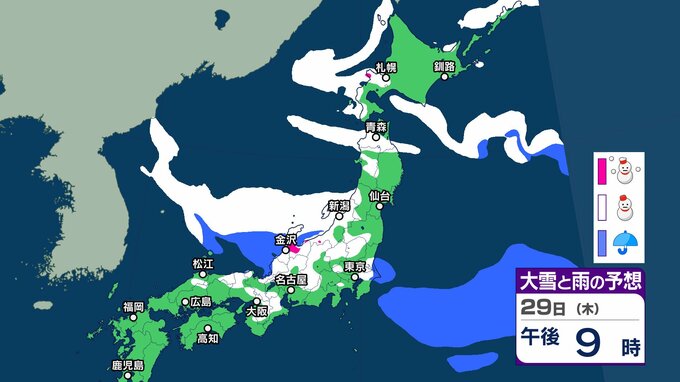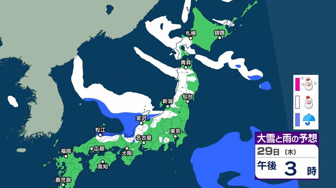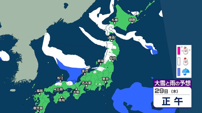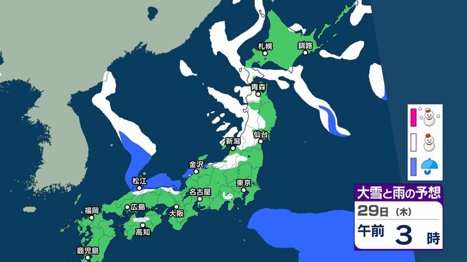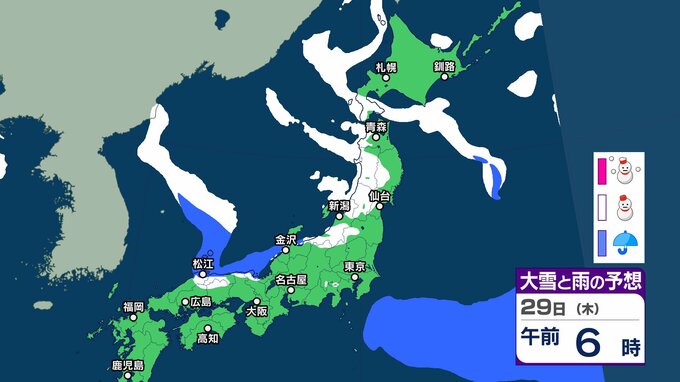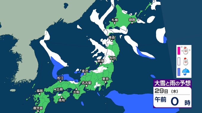 【大雪予報】東北地方から山陰では積雪の深さが平年の2倍以上 大雪や路面の凍結による交通障害に注意、警戒を【気象庁 24日(土)~29日(木)の雪雨シミュレーション/24日午後7時更新】 RSK山陽放送 2026年1月24日(土) 19:22 国内 天気 29日(木) 気象庁の雪と雨のシミュレーションによりますと、29日は、東北や北陸、山陰などの日本海側を中心に雪の予報となっているほか、北陸など一部では夜に大雪のおそれがあるということです。 37 38 39 40 41 43 44 ▶雪と雨のシミレーションをみる