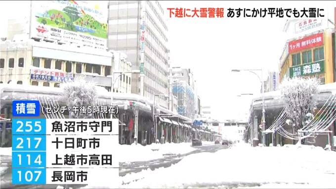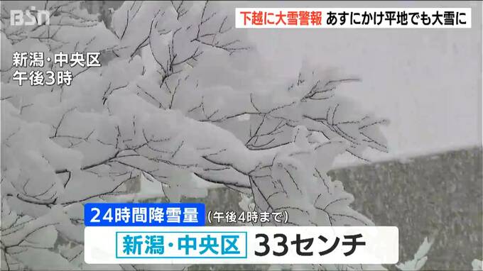 新潟県内は25日にかけ平地でも大雪となる見込みで、25日午後5時半現在、新潟と新発田、五泉地域に大雪警報が出されています。