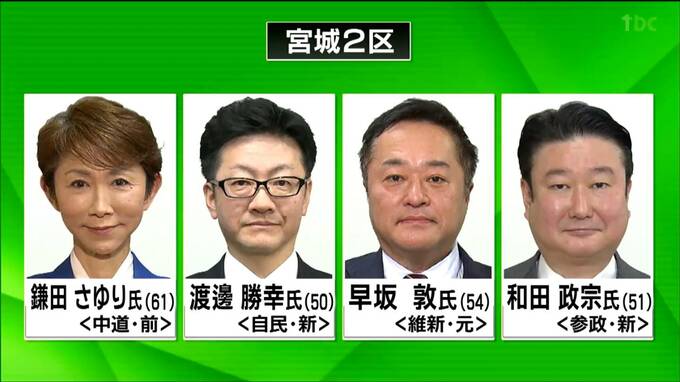 宮城2区では、ほかに中道改革連合の前職・鎌田さゆり氏、自民党の新人・渡邊勝幸氏、日本維新の会の元職・早坂敦氏、参政党の新人・和田政宗氏が立候補を予定しています。