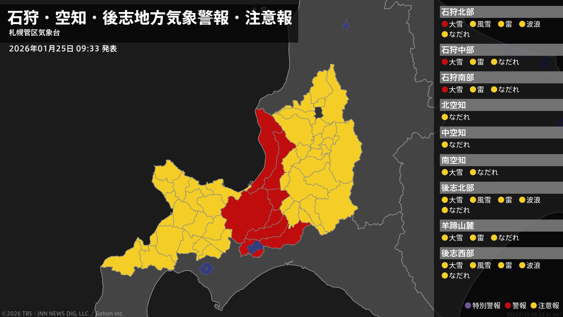 気象台は、午前9時33分に、大雪警報を石狩市、当別町に発表しました。