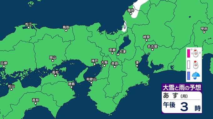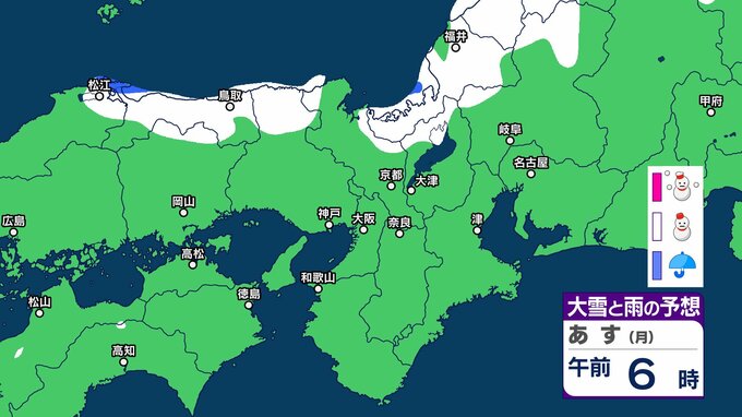 気象庁によりますと、26日の京都府は、寒気や湿った空気の影響でおおむね曇り、北部を中心に明け方にかけて雪が降るでしょう。