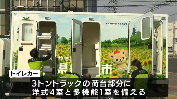 これが総社市のトイレカーです。市民の防災意識の向上につなげたいと導入したもので、3トントラックの荷台部分に洋式が4室と多機能1室を備えています。