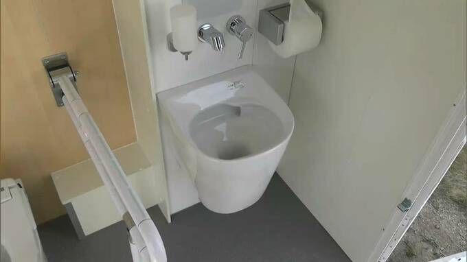 搭載した760リットルのタンクにより約1000回の使用が可能で、電力はソーラー発電でまかないます。便座にはヒーターと洗浄機能がついていて、多機能トイレにはリフトが設けられており、体の不自由な人にも配慮したものになっています。
