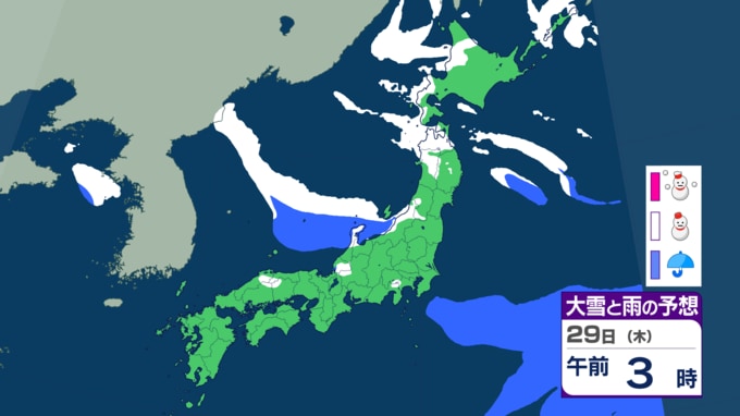 【大雪情報】寒波は25日(日)で一旦出口へ 次は29日(木)から再び大雪の恐れ 2月1日(日)は「南岸低気圧」で太平洋側も雪か 雨雪シミュレーション 長崎放送 2026年1月25日(日) 13:00 国内 【1月29日(木)〜30日(金)】寒波が再襲来 28日(水)から再び冬型が強まり、29日〜30日は再び強い寒気が南下します。 北日本から東日本の日本海側を中心に、再び大雪となる恐れがあります。 せっかく除雪した場所に再び積もる可能性があるため、早めの備えが必要です。