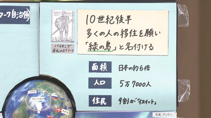 島としては世界最大で、日本の6倍ほどありますが、人口は5万7000人。住民の9割が北極圏の⺠族「イヌイット」です。