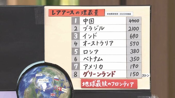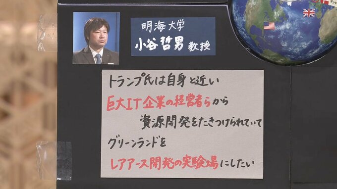 トランプ政権の戦略に詳しい明海大学の小谷哲男教授は、「トランプ氏は、自身と近い巨大IT企業の経営者らから資源開発をたきつけられていて、グリーンランドをレアアース開発の実験場にしたい」と考えていると指摘。