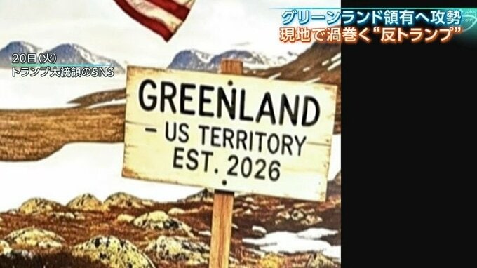 20日、トランプ氏が投稿した画像には、グリーンランドに立てられた看板に「2026年からアメリカ領」と書かれています。