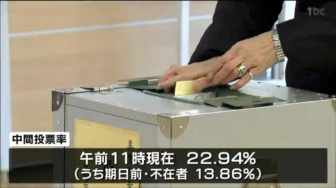 美里町の25日現在の有権者数は1万9460人で、このうち期日前投票をした人は2681人です。期日前投票と不在者投票を含めた中間投票率は午前11時現在で22.94%となっています。