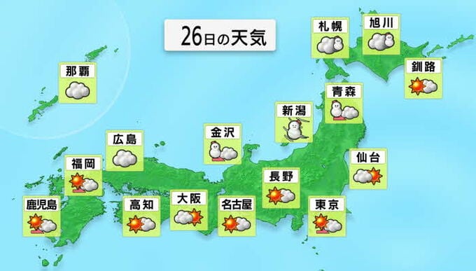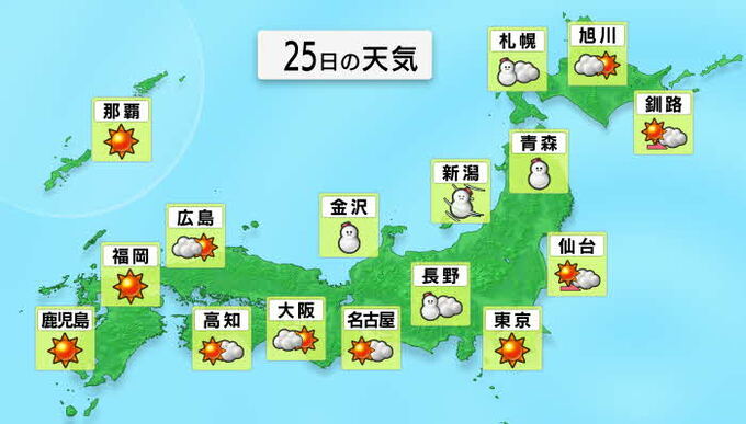 東日本と西日本では25日は、北日本では26日にかけて、大雪や路面の凍結による交通障害に警戒してください。