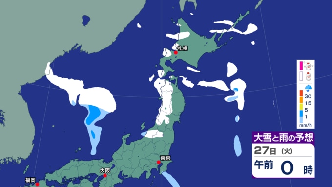 26日午前6時から27日午前6時までに予想される24時間降雪量は多い所で、