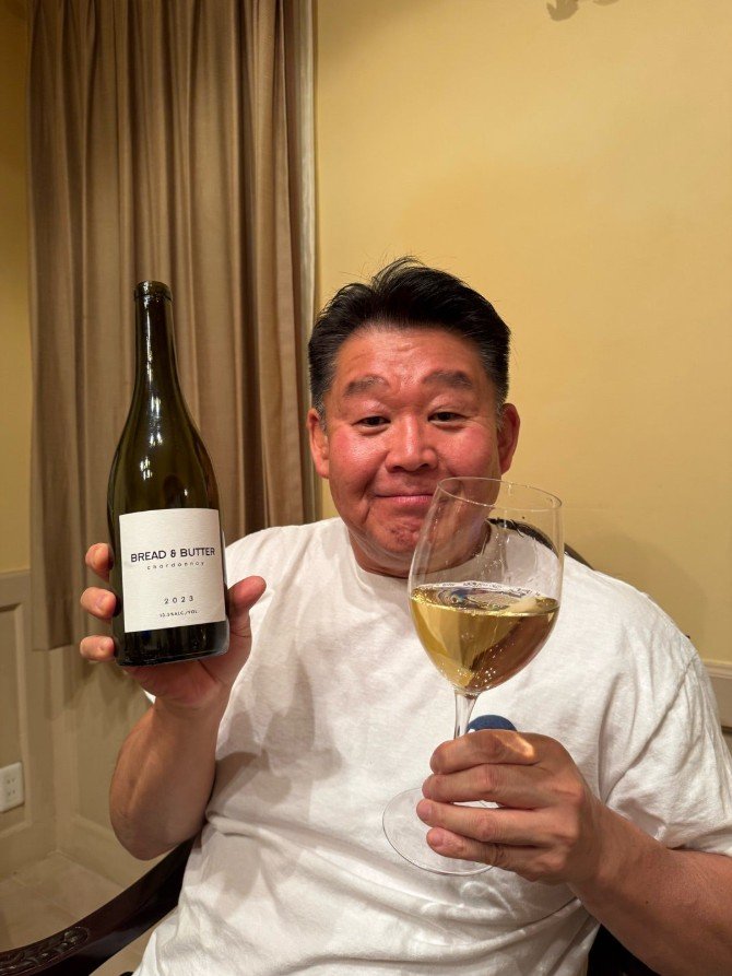 また、食事に合わせて白ワインも楽しんだ様子。「バニラみたいな甘い香りがして美味しかったです!妻と一緒にいただきました」と綴り、カリフォルニアワインの人気銘柄「BREAD & BUTTER」のボトルを手に、柔らかな笑顔を見せています。