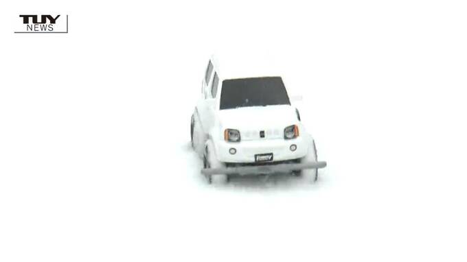 雪道を疾走するのは、模型自動車の「ミニ四駆」です。