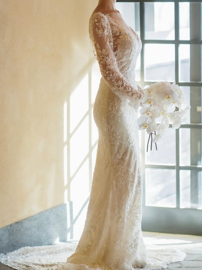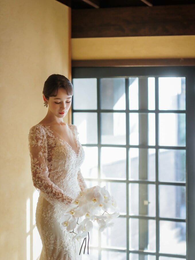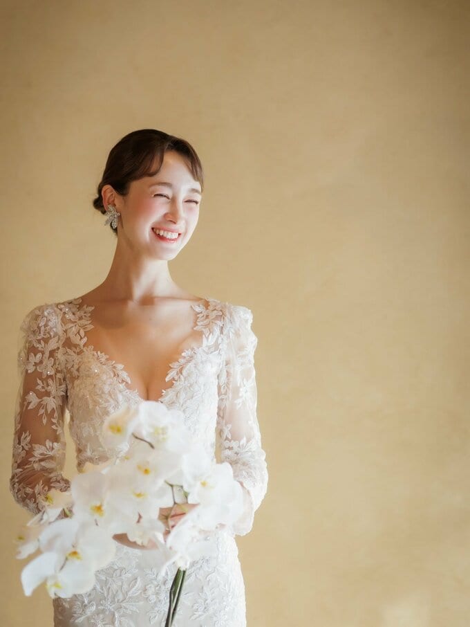「迷いすぎて30着ほど試着した中で、一番ときめきを感じたこの一着に」と迷いに迷った一着であることを明かし、「全面刺繍のレースがとても繊細で、光に当たるたびキラキラと輝いて、まるでドレスそのものがジュエリーみたいな華やかさ」と決めた理由をつづっていました。