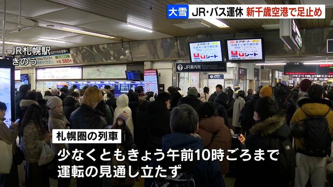 北海道石狩地方を中心とする記録的な大雪でJRやバスは運休が相次ぎ、新千歳空港では大勢の人が足止めされています。