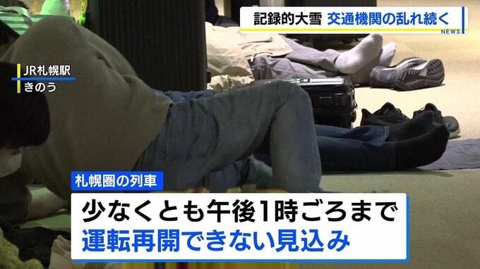 北海道石狩地方を中心とする記録的な大雪によって、新千歳空港で大勢の人が足止めされたほか、JRなど交通機関の乱れも続いています。