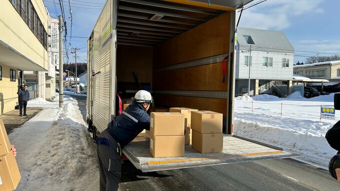 26日は午前9時前から県選挙管理委員会の職員が送り先を確認したあと、雪で足もとの悪いなか、投票用紙の入った段ボール箱をトラックに積み込みました。