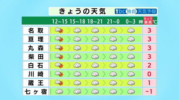 昼頃にかけては日差しが十分届きますが、気温が上がらず、最高気温は高いところでも3℃程度にとどまる見込みです。