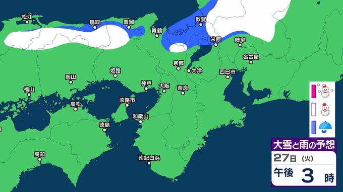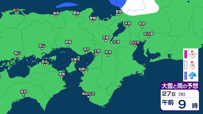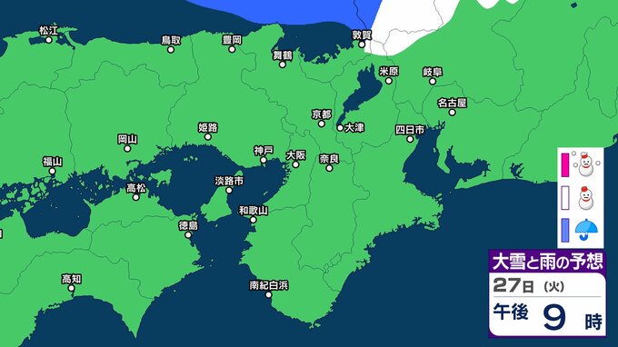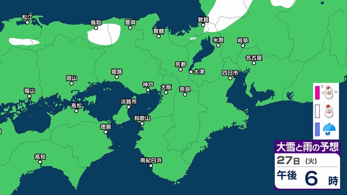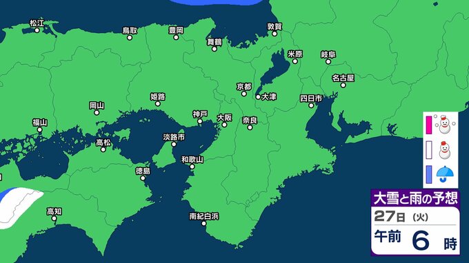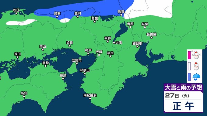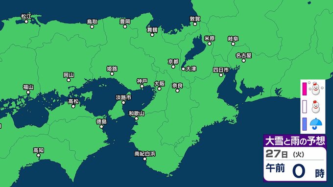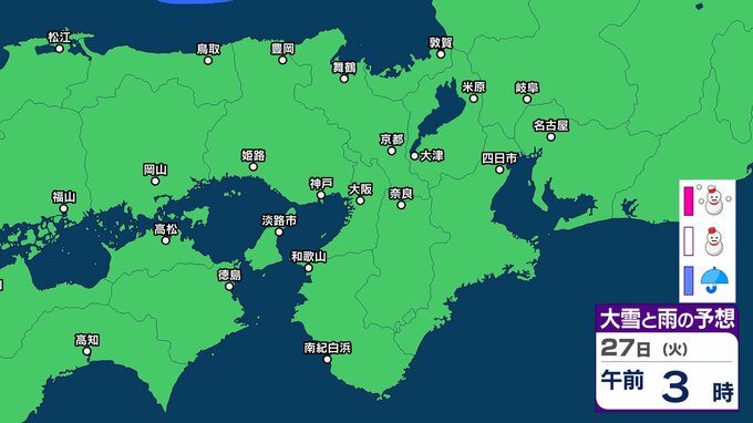 【関西の雪 どうなる?】週後半に冬型の気圧配置が強まる見込み→広い範囲で雪か? 26日(月)~31日(土)雪雨シミュレーション 大阪・京都・神戸・滋賀・奈良・和歌山の天気予報【気象庁 26日現在】 RSK山陽放送 2026年1月26日(月) 11:24 国内 天気 27日(火) ▶26日(月)~31日(土)近畿地方の雪雨シミュレーション ▶大津・京都・大阪・神戸・奈良・和歌山の16日間天気予報