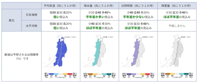 東北日本海側:平年並か多い見込み 東北太平洋側:ほぼ平年並の見込み