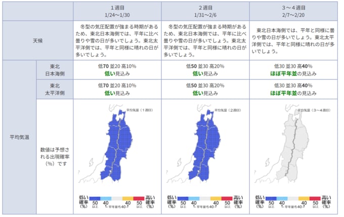 東北日本海側:低い見込み 東北太平洋側:低い見込み